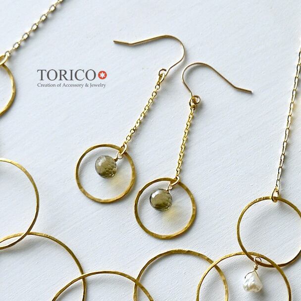シンプルなサークルフープと、透明感のあるビアクォーツが揺れるシンプルピアス。